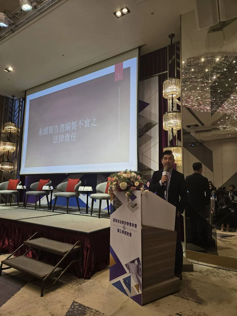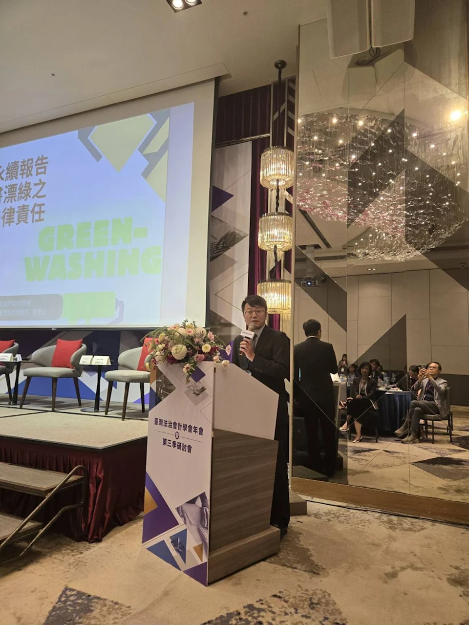 議題二「永續報告書漂綠之法律責任」由學會新任祕書長紀凱峰報告,其簡要說明了目前永續報告書之法律屬性及定位難題,及永續報告書「漂綠」不實之重大性判斷問題,並提出修法建議及展望。與談人抬北地檢署劉韋宏檢察官則詳細說明了不實「漂綠」之行為態樣及現行法下可能涉及之刑事責任,並呼應修法以明確化永續報告書法律定位及相關編製人員與確信機構之法律責任。